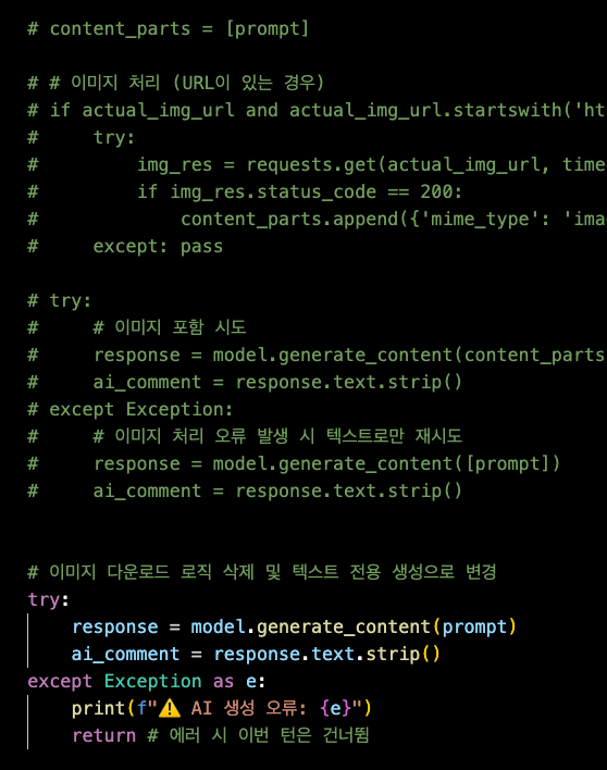 이미지 인식 기능을 전면 제거(Deprecate)하고, 텍스트(제목+본문+기존댓글) 문맥 분석에만 집중하기로 결정. 결과적으로 속도 향상과 자연스러움을 동시에 얻었다.