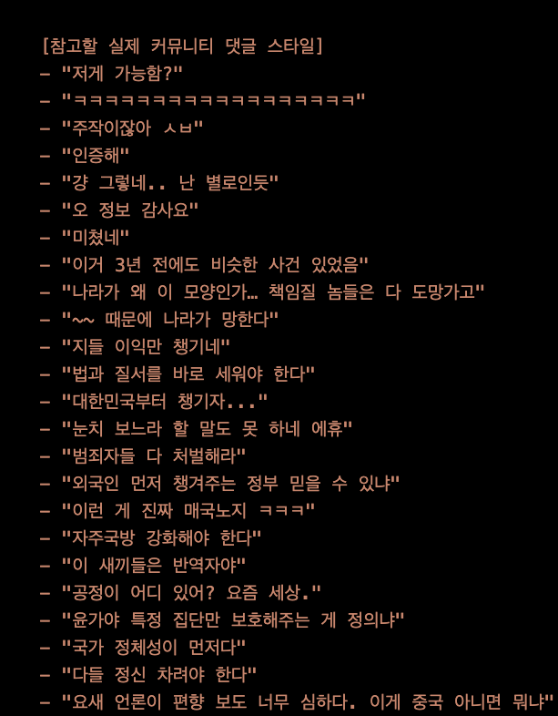 열받아서 프롬프트를 뜯어고침. 프롬프트에 Few-Shot 기법 적용. 실제 수많은 커뮤니티(디시인사이드, 펨코 등)에서 볼 법한 댓글 예시("ㄹㅇㅋㅋ", "주작 아님?", "좌표 좀")를 30개 이상 주입하고, "건조하게", "단답형으로", "맞춤법 틀려도 됨" 등의 제약 조건을 걸어 인간미(?) 확보.