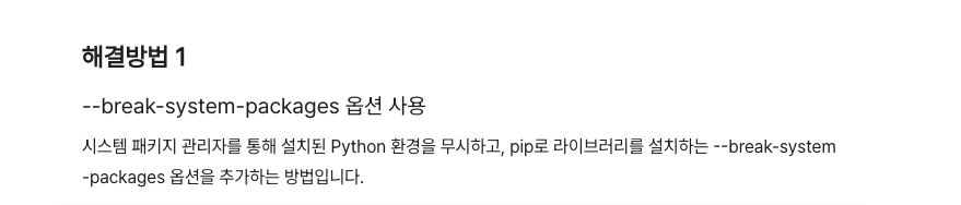 어차피 로컬에서 테스트니까 과감하게 --break-system-packages로 시스템 파이썬에 라이브러리를 강제 설치함. (단일 목적 봇이므로 의존성 충돌 우려가 적다고 판단)
