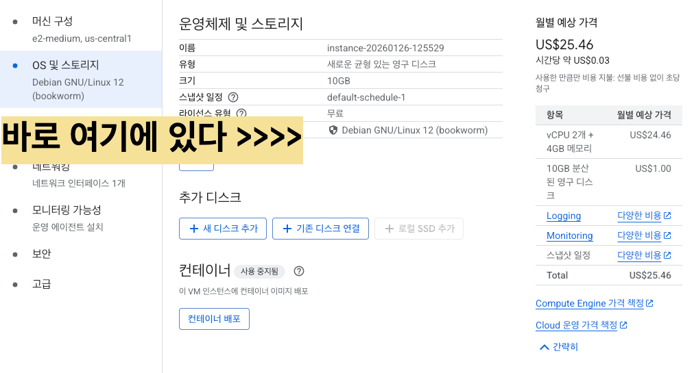 2026년 GCP 콘솔 UI 개편으로 인해 무료 티어 조건인 '디스크' 선택 메뉴가 숨겨져 있었음. 기본값인 '균형 있는 디스크'로 만들면 월 $1~2가 과금됨
