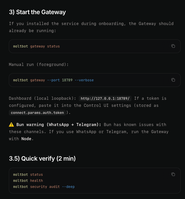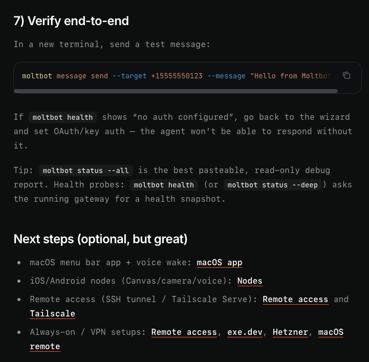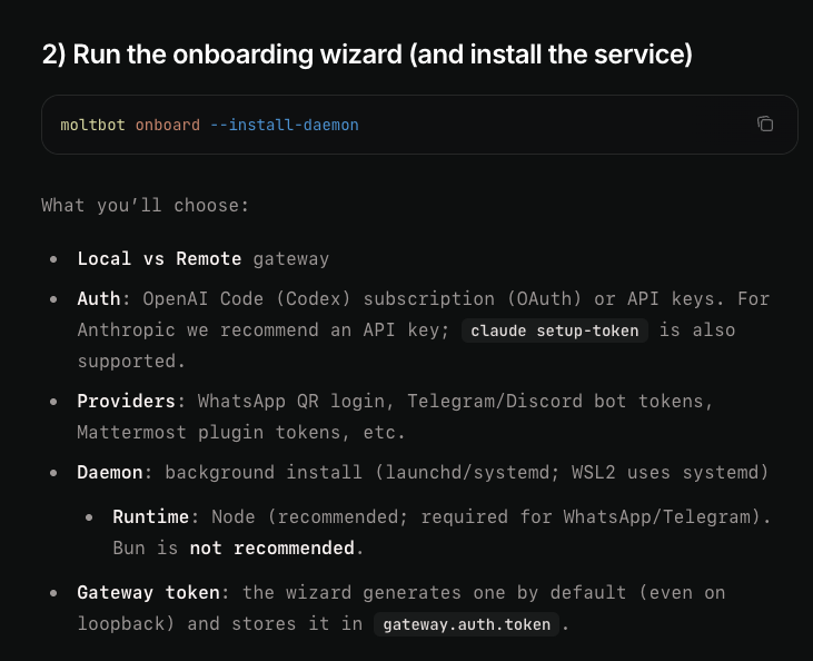 온보딩 가이드: https://docs.molt.bot/start/onboarding