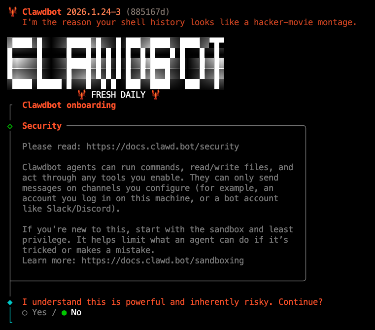 설치가 완료되면 'CLAWD BOT' 로고와 함께 보안 관련 안내가 출력된다.