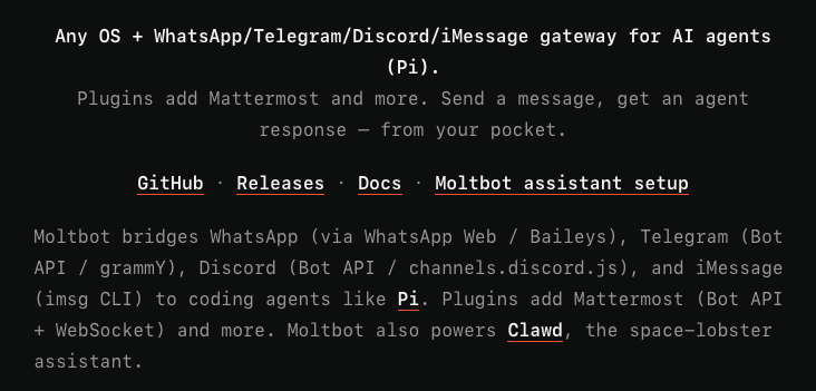 MoltBot은 WhatsApp, Telegram, Discord 같은 메신저 앱과 AI 에이전트를 연결하는 게이트웨이(Gateway) 역할을 한다.